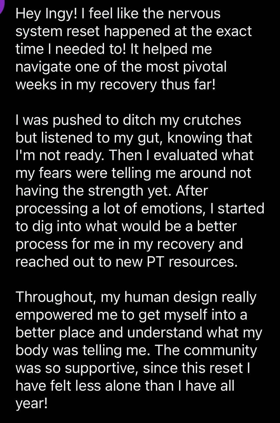 This isn’t just rehab. It’s where nervous system work, mindset, and Human Design come together to help you feel safe, seen, and strong again. You don’t have to push through alone.You get to rebuild with support, move with confidence, and finally feel like you again.